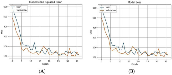 Performance of the regression model (LeNet-4 created using the layer-by-layer creation option) during training using a standard regression dataset (Boston housing), presenting the estimated (A) mean squared error and (B) loss.