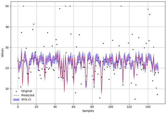 Forecasts of the regression model (LeNet-4 created using the layer-by-layer creation option) in the test data training using a standard regression dataset (Boston housing), where the 95% confidence interval is presented.