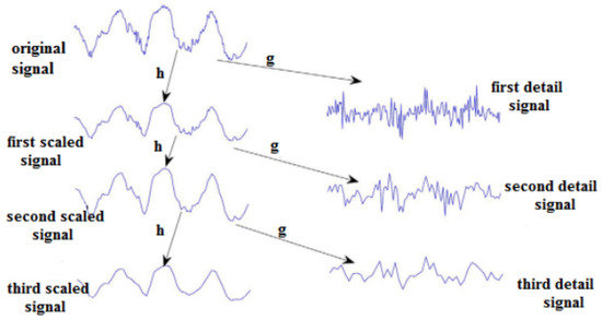 where k and j, respectively, stand for the discretized translation and dilation parameters. The diversity between the original and approximate signals may extracted by mixing the original signal with the use of a high-pass filter (g) (Figure 2), which is made from a wavelet basis function: [40].