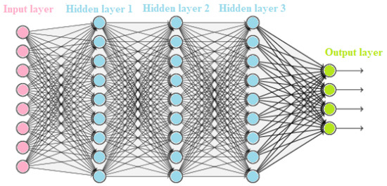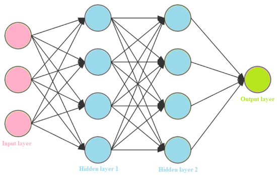 An organism’s nervous system, which is made up of several neurons connected in order to process data. Similar to human brains, ANN models may acquire knowledge through training, store it, and use it to estimate previously unobserved datasets [41]. The most popular ANN model is the artificial multilayer perceptron (MLP) NN. A general MLP net is an n layer NN . The MLP’s design generally comprises three levels: input, hidden, and output layers, as depicted in Figure 3. Therefore, gradient descent or conjugate gradient techniques are frequently used to back-propagate errors between targets, or desired values, and network outputs when training MLP [42,43].