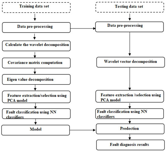In this study, the MSPCA model was applied with the goal of merging the PCA’s capacity to extract the corresponding cross-correlation betwixt variables with the orthonormal wavelets’ capacity to split features from noise and avoid the auto-correlation between the obtainable measurements. In order to combine the outcomes at adequate scales, the MSPCA technique processes and computes a PCA model of the wavelet coefficients at each scale. Accordingly, the pertinent attributes are attained for each scenario by selecting only those latent variables that capture the relationship betwixt the variables after the elimination of less important signal features. Thus, for the purpose of fault diagnosis, the most pertinent features are fed into NN classifiers. A wavelet decomposition is utilized to remove errors, decrease noise, and decorrelate the relationship between the stochastic measurements, once measurements representing healthy and various potential defective operating modes in the process are provided. The data gathered while the system is in normal operation is then used to develop a PCA model. The obtained dataset is projected onto a subspace of positive right directions while maintaining the information about the most collected features. The resultant PCA model’s structure is described by the directions of the subspace projector, whose dimension is smaller than that of the raw dataset. With the use of this projection technique, various important attributes are gathered for each situation. Subsequently, a bank of various classifiers is trained using a range of attributes as input and their associated labels as the desired output. Otherwise, a comparison between the resulting classifier output and the set of feature labels is evaluated in order to generate an efficient decision.