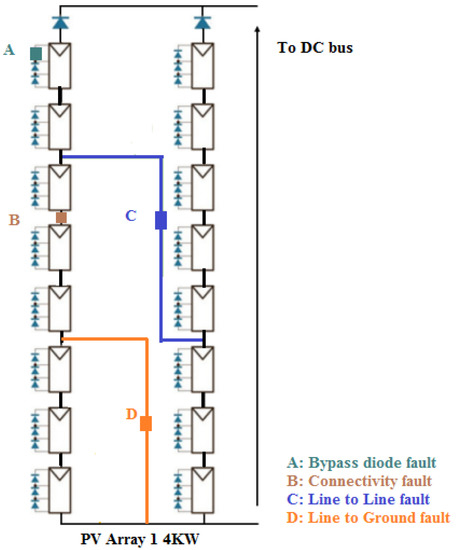 As shown in Table 1, we used five different types of faults to introduce various scenarios into the and systems in this work; for example, PV1’s simple faults include four possible fault scenarios: (line-to-line fault) is injected betwixt two distinct points; a line-to-ground fault () is considered in String1 () positioned betwixt one point and the ground; (connectivity fault) is injected in the first string between two modules; impacts the bay-pass diodes by injecting a variation in resistance, the diverse positions of the aforementioned failures are shown in Figure 8.