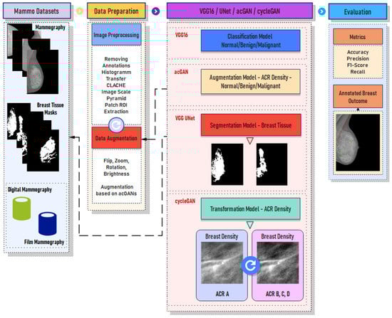 Figure 2. It consists of three main modules: (a) the data preparation module where image preprocessing and data augmentation take place, (b) the deep learning module where breast tissue segmentation, breast density transformation, and suspicious region detection are performed, and finally, (c) the evaluation module where annotation of abnormal regions on the given mammogram under examination is performed. To make our system more robust and to consider the different types of mammograms acquired during examination (fully digital, as well as scanned X-ray film), we thoroughly tested our system using five different datasets containing digital and film-scanned mammograms.