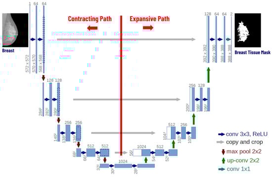 The architecture of the U-NET model with an input sample size of 572 × 572 pixels as input. The training procedure was conducted using the INbreast database.