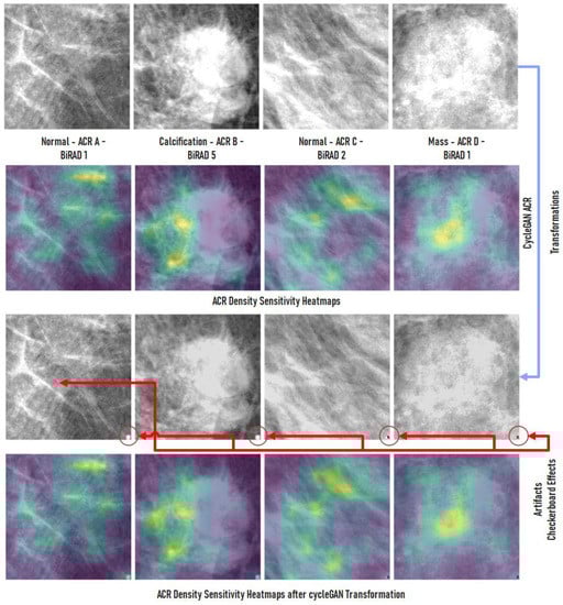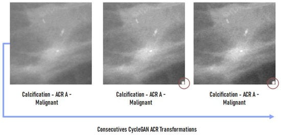 16]. A crucial methodological characteristic of CycleGAN is that it can train on unpaired data without the need for matching image pairings in the source and target domains. As our datasets lack image pairings and the same patient’s breast cannot belong to both the high and low breast density domains, using unpaired training data confirmed that CycleGAN would work with our datasets. The main contribution of our system is taking breast density into account, and by using a CycleGAN model, transforming the density of the ROI’s tissue to match the characteristics of an ACR-A class tissue. This process significantly improves recognition accuracy while reducing the number of undetected ROIs due to their dense breast tissue.