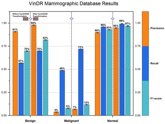 CNN performance before and after CycleGAN transformations—VinDR—Mammographic Database.