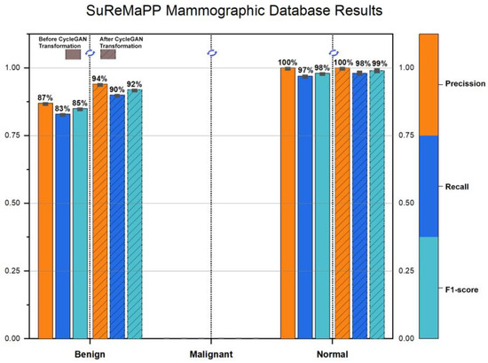 CNN performance before and after CycleGAN transformations—SuReMaPP—Mammographic Database.