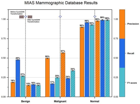 CNN performance before and after CycleGAN transformations—MIAS—Mammographic Database.