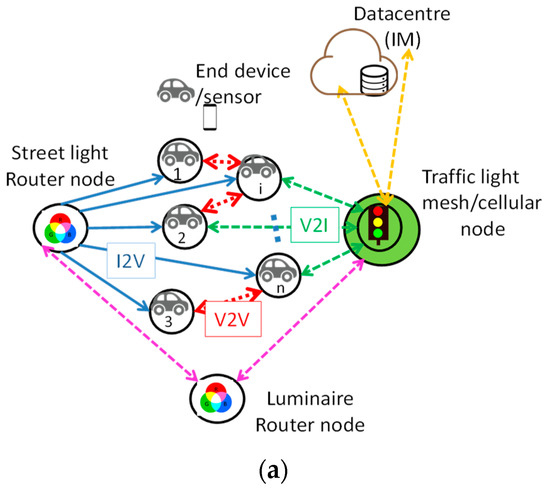 Figure 3a, presents a draft of a mesh cellular hybrid structure that can be used to create a gateway-free system. As illustrated the streetlights are equipped with one of two types of nodes: A “mesh” controller that connects with other nodes in its vicinity. These controllers can forward messages to the vehicles (I2V) in the mesh, acting similar to routers nodes in the network. The other one is the “mesh/cellular” hybrid controller that is also equipped with a modem provides IP base connectivity to the Intersection Manager (IM) services. These nodes act as border-router and can be used for edge computing [29]. This architecture enables edge computing and device-to-cloud communication (I2IM) and enables peer-to-peer communication (I2I), to exchange information, by ensuring a secure communication from a street light controller to the edge computer or datacenter, through a neighbor traffic light controller with an active cellular connection and enable peer-to-peer communication, to exchange information between V-VLC ready connected cars (Figure 3b). It performs much of the processing on embedded computing platforms, directly interfacing to sensors and controllers. It supports geo-distribution, local decision making, and real-time load-balancing.