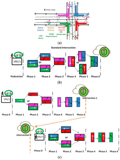 Based on the simulated traffic scenario (Figure 2) and utilizing V-VLC request/response messages, a phasing diagram was drawn, for functional areas with two-way–two-way four-legged (Figure 9a) and split (Figure 9b) intersections.