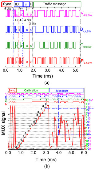 Based on the measured photocurrent signal by the photodetector, it is necessary to decode the information received. For this purpose, a calibration curve is previously defined to establish this assignment. In Figure 6b, calibration curve that uses 16 distinct photocurrent thresholds resultant from the combination of the RGBV-modulated signals from the VLC emitter is plotted [29]. The correspondence between each footprint and the photocurrent level is highlighted on the right side of Figure 6b. Here, the MUX signal obtained at the receiver as well as the coded transmitted optical signals is displayed. The message, in the frame, start with the header labelled as Sync, a block of 5 bits [10101] imposed simultaneously to all the emitters. In the calibration block (second block), four calibrated R, G, B, and V optical signals are transmitted at the same time. Here, the bit sequence was chosen to allow all the on/off sixteen possible combinations of the four RGBV input channels (24). In the last block, a random message is transmitted. A periodic retransmission of the calibration curve is needed to ensure the correspondence to the output signal and an precise decoding of the transmitted information. Comparing the calibrated levels (d0–d15) with the assigned 4-digit binary [RGBV] codes, ascribed to each level (pointed out at the right side of Figure 6b), the decoding is straightforward, and the message decoded. Taking into account the frame structure (Figure 6a), after decoding the MUX signals, the pose (position and direction), the kind of transmitter (IM or Vehicle) and traffic message are revealed [30].