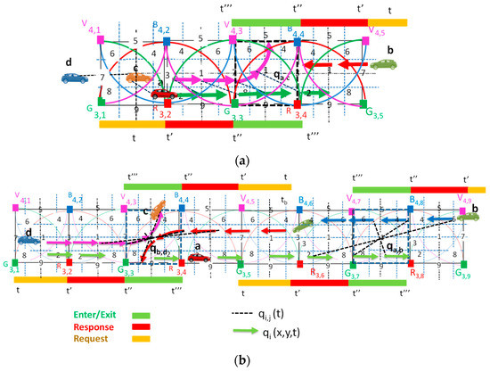 Figure 7. Movement of the cars, in the successive moments, with their colorful poses (color arrows) and qi,j spatial relative poses (dot lines). (a) Four-legged intersection. (b) Split intersection.