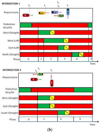 Here, Phase 2 and Phase 5 offer two alternatives, only one of which may be displayed on any cycle. Vehicles are stopped on all approaches to an intersection while pedestrians are given a WALK indication, and the phasing is referred to as “exclusive”. Functional barriers (dash dot lines) exist between exclusive pedestrian and Phase 1 and Phase 6. A vulnerable road user-only phase and the separation of traffic flow on the north/south direction allows the introduction of bike lanes in Intersection 1 (south and east straight movements) and Intersection 2 (north straight movement), reducing vehicle and bicyclist potential conflict points. Taking into account Figure 2, two movements can proceed simultaneously without conflict; hence, two of the timing functions will always have simultaneous control. The IM has to allocate priority.