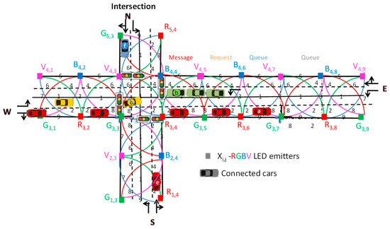 A V2X communication link, in a two-way–two-way traffic light-controlled crossroad, was simulated. Typical four-legged intersections are linked to sixteen roads: eight roads incoming from and eight roads exiting to neighboring crossroads north, west, south, and east. In Figure 2a, the lighting plans of a standard intersection are shown, while in Figure 2b the corresponding plan for a split intersection is displayed. The generated joint footprints in both crossroad regions (LED array = RGBV-modulated color spots) are also inserted. The split intersection (Figure 2b) starts with only one main street that connects two crossroads (Intersection 1–Intersection 2). Road request and response segments, offer a binary (turn left/straight or turn right) choice. Moreover, vehicle’s movement is known in each intersection and can be anticipated, considering the flow dependencies between two closely spaced signals. In coordinating traffic signals it is assumed that a vehicle’s movement along a main street (W >> E) is known and can be anticipated. Knowing when a vehicle is going to pass intersection “1” allows for a green light to be pre-programmed for that vehicle’s direction of travel. The two intersections are referred to as one entity, the interchange. Signal timing refers not only to the phasing patterns at the two intersections, but also to the cycle length and offset relationship between them. The two controllers provide high flexibility since they allow the use of all phasing patterns for both intersections [16].