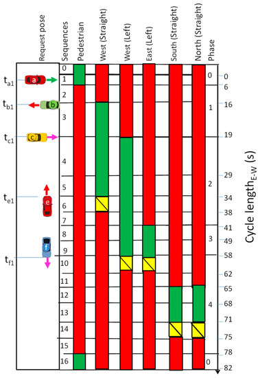 Traffic volumes that arrive at the intersection are the same in both. Here, the traffic controller uses request and response messages, from vehicles a, b, c, d, e and f, fusing the self-localizations qi (t) with their space relative poses qij (t) to generate phase durations appropriate to accommodate the demand on each cycle. Each driving vehicle is assigned an individualized time to the request (t) to enter the intersection, and t[x] is the request time of vehicle x with their pose representations.