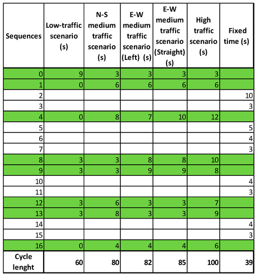Adaptive sequences 8 and 9 kick off Phase 3 (Figure 11) and the sequence times will be adjusted according to the variation of rt for the left turn of the bi cars. A new phase, Phase 4, begins and includes two adaptive sequences, sequence 12 and 13. Their time intervals will be as short as possible, which will free up capacity in the cycle for the E-W flows that are heavily loaded. Taking into account the accumulated total waiting time in each arm, an 85 s cycle is recommended for this type of flow. The times associated with each sequence can be visualized in Figure 11.