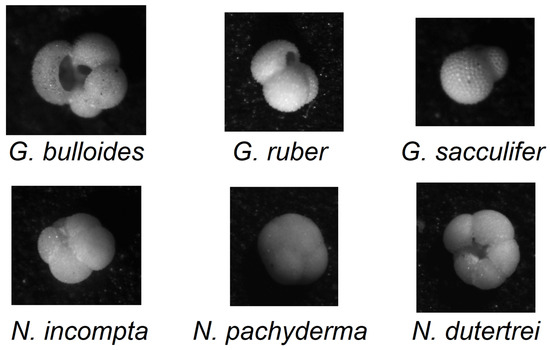 - Mitra, R.; Marchitto, T.M.; Ge, Q.; Zhong, B.; Kanakiya, B.; Cook, M.S.; Fehrenbacher, J.D.; Ortiz, J.D.; Tripati, A.; Lobaton, E. Automated species-level identification of planktic foraminifera using convolutional neural networks, with comparison to human performance. Mar. Micropaleontol. 2019, 147, 16–24. [Google Scholar] [CrossRef]