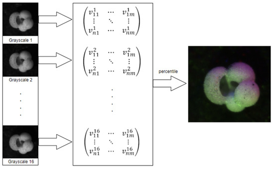 Figure 3. Percentile pre-processing pipeline, sourced from [25]. - A “Gaussian” image processing method that encodes each color channel based on the normal distribution of the grayscale intensities of the sixteen images;