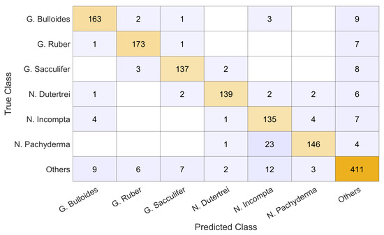 The highest precision was instead achieved on the N. dutertrei class, along with the second-highest F1 score and third-highest recall. Only six patterns were misclassified as false positives, of which two were G. sacculifer, one was N. incompta, and one N. pachyderma, as well as two Others, shown in Figure 8.