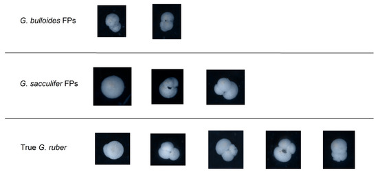 Visual comparison of false positives (FPs) in the classification of G. ruber with hand-picked true samples.