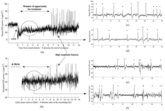 We have previously shown that micro-scale sharp-wave EEG patterns with amplitudes between 20–80 μV and a duration between 70 and 250 ms (frequency range: 4 to 14.3 Hz, in the (4–8 Hz), (8–12 Hz), and lower-beta band (i.e., 12–14.3 Hz)) were superimposed on a suppressed EEG background, within the latent phase of fetal sheep data (103 ± 1 days, human brain maturation equivalent ~28–30 weeks) which are a reliable marker for hypoxic-ischemic encephalopathy (HIE) (see Figure 1c,d) [6,15]. We have shown that EEG sharp-waves can help to predict the latent phase of injury after an HI insult, where a larger number of sharp-waves within the first 30 min post-HI is associated with greater subcortical neuronal survival in the caudate nucleus (r = 0.80). Conversely, greater numbers of sharp-wave activity between 2–4 h after HI are associated with more damage and a reduced neuronal survival in the same subcortical region (r = −0.83) [6]. This experimental observation highlights the significance of these micro-scale EEG waveforms in a suppressed background as early indicators of HIE, emphasizing the necessity to explore their presence in bedside monitoring, at birth.