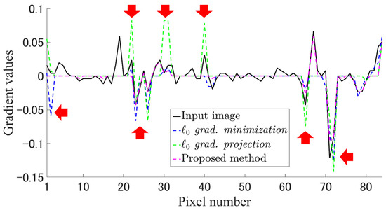 The major drawback of minimizing the total variation regularization based on the - or -norms is that it yields pseudo-edge artifacts, such as an undesirable staircasing effect on the homogeneous regions in many cases. These artifacts are more severe in the case of the -norm, as it has significant flattening effects. Figure 1 plots an example of the vertical first-order gradient signals of an input image and the smoothing results obtained by the two conventional methods—one is the gradient minimization [31], and the other is the gradient projection [37]—and the proposed methods with the box-type gradient constraint. The gradient signals of the gradient minimization and the gradient projection contain the gradients denoted by arrows that do not originally exist in the input image. Owing to the proposed gradient constraint, the gradient signal of the proposed methods is lower than that of the input image. When a reference image has local smoothness properties, artifacts such as halos and pseudo-edges can be suppressed by the proposed constraint. Similar results are obtained with the other channels and the horizontal direction.