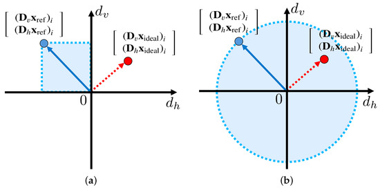 Examples of the proposed gradient constraints: vertical and horizontal axes and represent gradient values of vertical and horizontal directions, respectively. The blue solid arrow and the dotted red arrow indicate the gradient vectors of reference and ideal images, respectively. The dotted blue box and circle represent areas that satisfy the gradient constraints, respectively. (a) Box-type gradient constraint. (b) Ball-type gradient constraint.