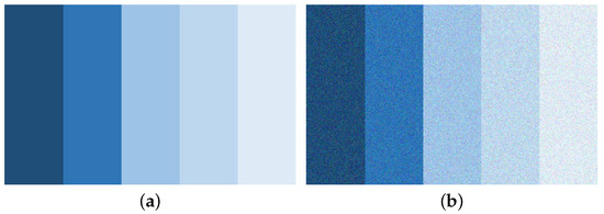 Let be a vectorized color image, and let N be the number of pixels. Further, let and be the vertical and horizontal first-order differential operators with a Neumann boundary, respectively; the differential operator is then defined by for a gray image and for a color image. In the gradient minimization, the group sparsity of the gradients is considered by concatenating the -norm [31,37,48], and it is defined as