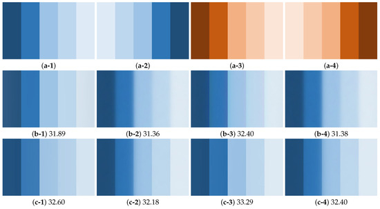 Figure 9a,b plot the PSNR [dB] and SSIM values averaged over ten test images, respectively. It can be seen that the PSNR and SSIM of the proposed methods are higher than those of the existing methods in most cases.