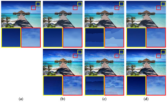 Figure 5 and Figure 6 show the smoothing and detail enhancement results obtained by the existing methods and the proposed methods (we took input images from an extensive database of royalty-free images https://pixabay.com/en/ accessed on 8 January 2018). In Section 4.2 and Section 4.3, since there are visually no differences between the results of the proposed methods with the box- and ball-type gradient constraints, we only show the results of the proposed method with the box-type gradient constraint. For a fair comparison, we adjusted the smoothing parameters of each method so that the -norms are the same in the input and output images. The scaling factor s was set to . Figure 5 and Figure 6 indicate that the contrast in the entire image is maintained for all methods. However, the results of [31] have halo-like artifacts in the region with gradation indicated by the red square window in (b), and the color of the clouds is changed. Pseudo-edge artifacts, such as the staircasing effect, occur in the sky region of the results of [37] (indicated by the yellow and red square windows in (c)). In contrast, our methods do not have these undesirable artifacts because the gradient constraints suppress pseudo-edges in the homogeneous regions.