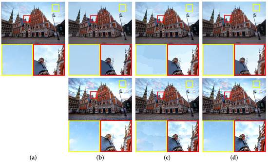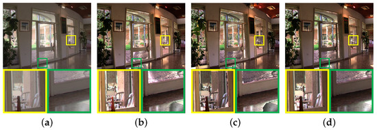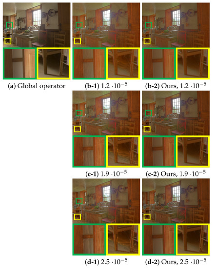 Figure 7 shows the tone-mapping results, where we also show the result of Reinhard et al.’s global tone-mapping operator [64] for reference. Figure 7b,c show that the halo and pseudo-edge artifacts occurred, especially at the boundary between the bright and dark regions. In contrast, the proposed methods sufficiently suppressed these artifacts.