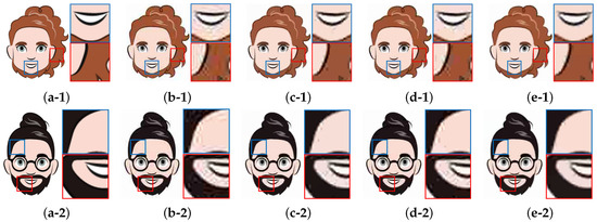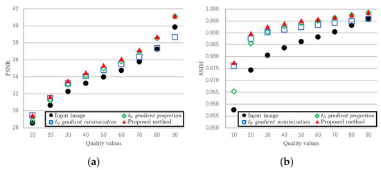 Input images were generated from clip-art images (we took ten test images from the dataset provided in https://google.github.io/cartoonset/ accessed on 20 July 2019), which were compressed by standard JPEG with quality values in the range of . The resultant images were evaluated by using two quality metrics: PSNR and structural similarity (SSIM) [65]. In each method, we adjusted the degree of noise removal to obtain the visually best restoration results, i.e., maximizing the smoothness while preserving the edges of the images as much as possible (we only showed the results of the proposed methods obtained with the ball-type gradient constraint because it is more robust than the box-type constraint for noise removal).