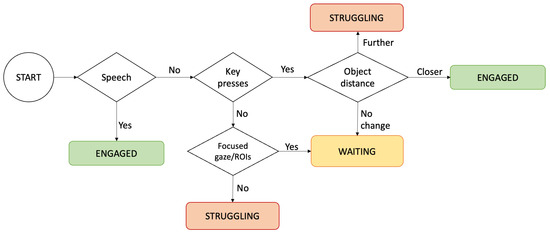 | 1 | Engaged | The participant is focused on the task, communicating, and progressing well. | Participant could be talking to their partner. Participant is using the controller and virtual object is moving closer to the target. Engaged = Speech Presence ∪ (Controller Manipulation ∩ Object Move Closer) |