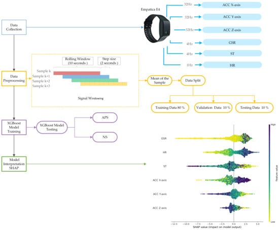 Data segmentation is the process of splitting signals into smaller data segments or windows for use in training models. The selection of an appropriate signal window is crucial, as it can affect the accuracy and interpretability of the analysis [26]. We segmented the time series biosignals into windows of 10 s with two-second time steps, which resulted in 39,021 samples for APS and 5967 samples for NS. The mean of GSR, HR derived directly from the BVP using the Empatica E4 algorithm, ST, and three-axis ACC were calculated over each window. The means of the signals for each time window were then used as features for training the XGBoost model. The label of each window was determined by taking the mode of the labels within the window. The dataset was split into training, validation, and testing sets with the following ratios: 80% for training, 10% for validation, and 10% for testing. We employed the stratified shuffle split, a combination of stratified k-fold and shuffle splitting, to maintain the same class distribution in the training, validation, and testing datasets as in the original dataset, thereby eliminating the risk of biased evaluation results due to class imbalance [27]. To ensure that all signals had the same scale, the training, validation, and testing data were standardized by subtracting the mean and dividing by the standard deviation of the training data. Figure 1 shows the overview of the machine learning pipeline, including data collection, data preprocessing, XGBoost model training, and model interpretation using SHAP.