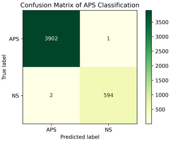 The XGBoost model with weighted training for classification of APS and NS achieved an overall testing accuracy of 99.93 %. Table 4 summarizes the classification accuracy using the metrics of precision, recall, and F1 score. Figure 2 shows the corresponding confusion matrix.