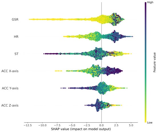 The SHAP technique can provide an interpretation of model predictions for individual instances. Figure 4 shows the force plot for a correctly classified APS instance. The contribution of each physiological signal to the prediction is indicated by its SHAP value, represented as a horizontal arrow. The length of the arrow indicates the magnitude of the SHAP value, with red arrows indicating positive SHAP values and blue arrows indicating negative SHAP values. The mean standardized values of the biosignals are shown under the arrows. In this correctly classified APS instance, the GSR, HR, ST, ACC Z-axis, and ACC Y-axis all have positive SHAP values, while the ACC X-axis has a negative SHAP value. The base value, or the expected value, represents the average model prediction over the entire training dataset, which equals 10.46. The sum of all SHAP values for this instance (2.87 for GSR, 1.99 for HR, 1.05 for ACC Y-axis, 0.81 for ST, 0.75 for ACC Z-axis, and −0.62 for ACC X-axis) combined with the expected base value of 10.46 equals 17.31. The sum of all SHAP values for this instance combined with the expected base value is higher than the base value alone, indicating that the sum of all signal contributions positively affects the model’s APS prediction for this instance. The positive standardized mean GSR value of 2.037 has the most significant positive effect on the model’s APS prediction, with a SHAP value of 2.87. The positive standardized mean HR value of 1.081 has the second-most significant positive effect, with a SHAP value of 1.99. Meanwhile, the negative standardized mean ACC Y-axis value of −1.989 has the third most significant effect, contributing positively to the model’s APS prediction with a SHAP value of 1.05.