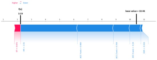 Figure 5 shows the force plot for the NS sample misclassified as APS. The sum of all the SHAP values for this instance combined with the expected base value is equal to 2.23, which is lower than the expected base value of 10.46. This indicates that the sum of all the contributions from the signal has a positive effect on the prediction of NS. However, ST contributed to the misclassification of the NS sample as APS; the negative standardized mean ST value of −0.672 has a positive SHAP value of 0.45, causing the model to indicate APS.