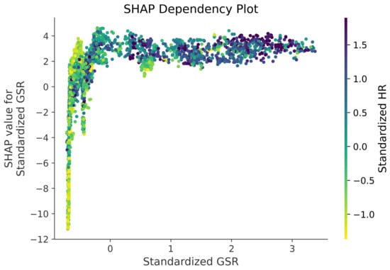 Figure 6 illustrates the dependency plot, showcasing the influence of GSR on the model’s predictions of APS detection considering the interaction with HR. The plot shows the SHAP values for standardized GSR versus the standardized GSR values, with each data point representing an individual prediction from the testing dataset color-coded based on the HR values. As seen in the figure, there is a positive correlation between the standardized GSR values and the GSR SHAP values. Higher GSR values are associated with higher SHAP values, indicating a stronger influence of GSR on the model’s predictions. Additionally, the color-coding based on standardized HR values demonstrates that elevated HR values (indicated by darker shades) are generally associated with higher GSR values. To quantify the relationship between GSR and HR, we calculated the Pearson’s correlation coefficient for the test set. The Pearson’s correlation coefficient, a measure of the linear correlation between GSR and HR, is 0.46 for the test set, a moderate positive correlation, suggesting that APS occurrence is associated with elevated GSR and HR values.