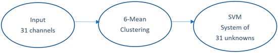The vector represents a data point in the n-dimensional space. Here, x is the vector of 31 channel cluster ids. The values of x can be integers 0 to 5, corresponding to six clusters. A 12 ∗ 31 matrix for 12 subjects and 31 channels are obtained. The main task of the linear SVM is finding the linear model []