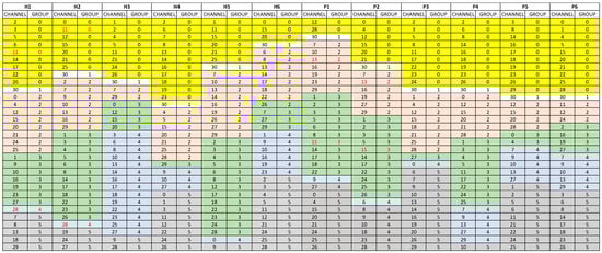 Six groups of channels for health controls H1 to H6 and PTSD cases P1 to P6 using 6-mean clustering method. Background colors indicated different clusters and red font values highlight the diagnostic channels.