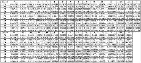 So, the main factor that affects the classification is vector which is the weight in the linear model. An assessment of this vector can help to show how the data points are classified and how the classification is determined. The weights, , indicate the importance of each channel for separating the channels into 6 groups for a given subject [].