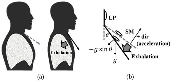 Figure 1 shows a schematic diagram of body changes and the location of the accelerometer during the exhalation phase of breathing. The acceleration utilized in Figure 1 is the acceleration perpendicular to the attachment surface of the device. In Figure 1a, the change in sternum position corresponding to lung volume alteration during exhalation is depicted. During normal exhalation, lung volume decreases, causing the angle between the SM and near the LP to diminish. The gray dotted line represents the SM’s normal position, while the solid black line depicts its position during exhalation. Figure 1b presents a schematic diagram replicating the SM’s position from Figure 1a. Here, let us denote the angle between LP and SM as and estimate the actual acceleration measured by the accelerometer. Both accelerometers gauge acceleration resulting from overall body movement and the angle θ between them. If the acceleration in LP is denoted as and the acceleration in SM as , the differential signal, i.e., the difference between the two signals, can be expressed as Equation (1).