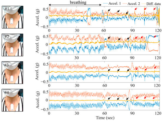 Figure 2 shows the data collected at each location. The blue solid line represents the measurements from the upper accelerometer, while the red solid line represents those from the lower accelerometer, positioned approximately 2 cm below the upper accelerometer. The solid yellow line illustrates the differential signal computed from the signals obtained by the two accelerometers. Black arrows indicate instances of saliva or simulated swallowing, while red arrows denote actual swallowing actions, such as drinking water.