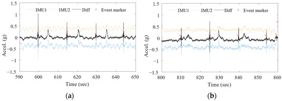 The method for capturing signals associated with swallowing was developed using two accelerometers. External movement was eliminated and vibration transmitted from within was confirmed. Figure 3a is a signal acquired four times during swallowing when the body was swaying side to side. The light blue and red solid lines are signals acquired from each accelerometer (IMU1, IMU2). The wave moving once every two seconds is observed due to the body movement of swaying. The black solid line indicates the differential signal which is the difference between the two accelerometer signals. The waveform in which the body sways side to side is removed from the original accelerometer signal. Additionally, the differential signal has a more distinct internal biometric signal caused by swallowing and heartbeat.