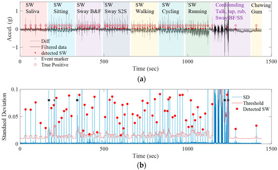 (a) Detection result of swallowing events during 7 types of activities and confounding motions; (b) standard deviation (SD) of the filtered signal and the adaptive thresholds for detecting the swallowing events.
