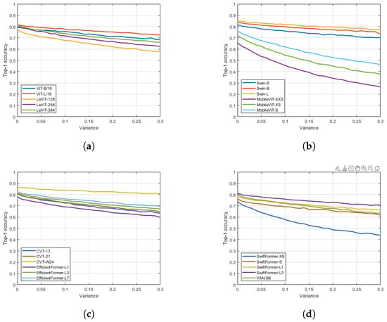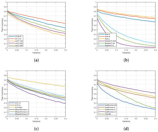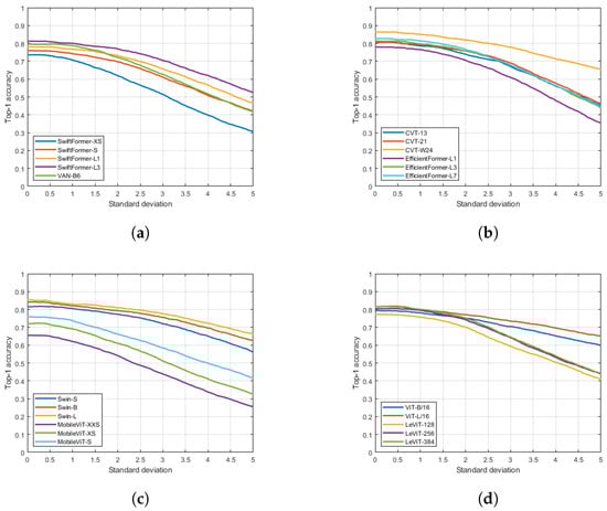 Top-1 accuracy rates under different additive Gaussian distortions. (a) SwiftFormer-XS, SwiftFormer-S, SwiftFormer-L1, SwiftFormer-L3, VAN-B6. (b) CVT-13, CVT-21, CVT-W24, EfficientFormer-L1, EfficientFormer-L3, EfficientFormer-L7. (c) Swin-S, Swin-B, Swin-L, MobileViT-XXS, MobileViT-XS, MobileViT-S. (d) ViT-B/16, ViT-L/16, LeViT-128, LeViT-256, LeViT-384.