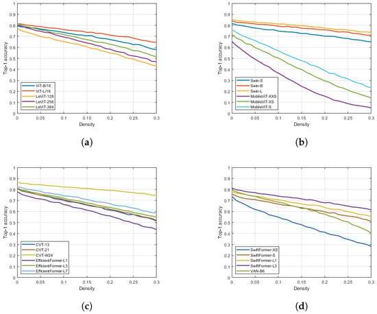Top-1 accuracy rates under different salt-and-pepper distortions. (a) SwiftFormer-XS, SwiftFormer-S, SwiftFormer-L1, SwiftFormer-L3, VAN-B6. (b) CVT-13, CVT-21, CVT-W24, EfficientFormer-L1, EfficientFormer-L3, EfficientFormer-L7. (c) Swin-S, Swin-B, Swin-L, MobileViT-XXS, MobileViT-XS, MobileViT-S. (d) ViT-B/16, ViT-L/16, LeViT-128, LeViT-256, LeViT-384.