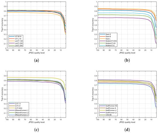 Top-1 accuracy rates under different JPEG distortions. (a) SwiftFormer-XS, SwiftFormer-S, SwiftFormer-L1, SwiftFormer-L3, VAN-B6. (b) CVT-13, CVT-21, CVT-W24, EfficientFormer-L1, EfficientFormer-L3, EfficientFormer-L7. (c) Swin-S, Swin-B, Swin-L, MobileViT-XXS, MobileViT-XS, MobileViT-S. (d) ViT-B/16, ViT-L/16, LeViT-128, LeViT-256, LeViT-384.