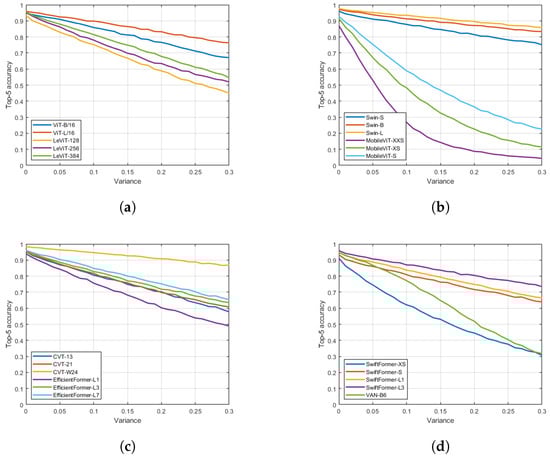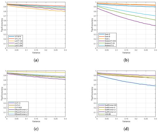 Top-5 accuracy rates under different multiplicative Gaussian distortions. (a) SwiftFormer-XS, SwiftFormer-S, SwiftFormer-L1, SwiftFormer-L3, VAN-B6. (b) CVT-13, CVT-21, CVT-W24, EfficientFormer-L1, EfficientFormer-L3, EfficientFormer-L7. (c) Swin-S, Swin-B, Swin-L, MobileViT-XXS, MobileViT-XS, MobileViT-S. (d) ViT-B/16, ViT-L/16, LeViT-128, LeViT-256, LeViT-384.