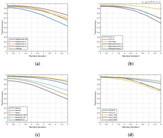 Top-5 accuracy rates under different additive Gaussian distortions. (a) SwiftFormer-XS, SwiftFormer-S, SwiftFormer-L1, SwiftFormer-L3, VAN-B6. (b) CVT-13, CVT-21, CVT-W24, EfficientFormer-L1, EfficientFormer-L3, EfficientFormer-L7. (c) Swin-S, Swin-B, Swin-L, MobileViT-XXS, MobileViT-XS, MobileViT-S. (d) ViT-B/16, ViT-L/16, LeViT-128, LeViT-256, LeViT-384.